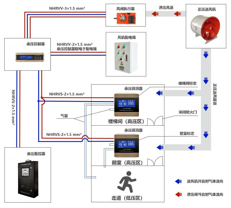 发生火灾时,余压监控系统启动,着火层及上下相邻两层风口开启,图中蓝色箭头表示正压送风机开启时空气的流动方向,依据安全逃生原则,加压送风应满足防烟楼梯间压力>前室压力>走道压力的压力递增分布。